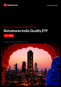 This Product Disclosure Statement outlines the key features of the Betashares India Quality ETF, including its investment objective, exposure to high-quality Indian companies based on fundamental screening, index methodology, fees and costs, risks (including emerging market and currency risk), and taxation considerations.